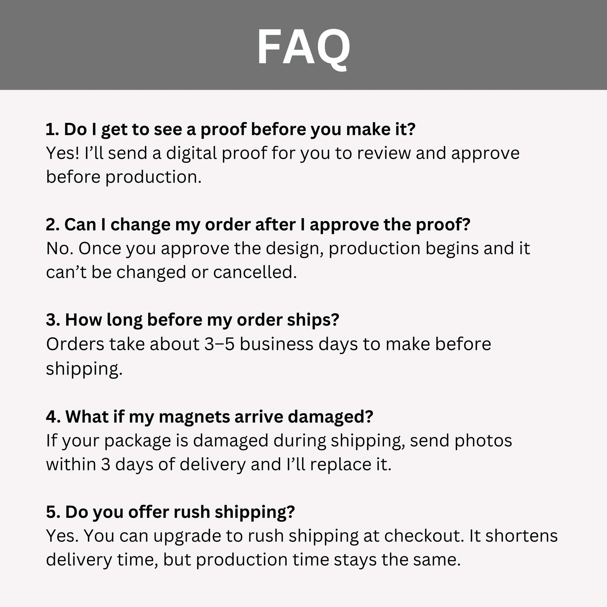 Your photo magnets are made just for you. Once you approve the proof, no changes, cancellations or refunds are accepted after production starts.